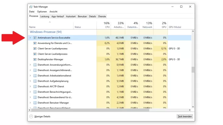 The Antimalware Service Executable process is usually conspicuous because it has a high CPU load in the task manager.