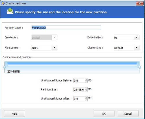 - Move the Slider to determine the size of the Partition.