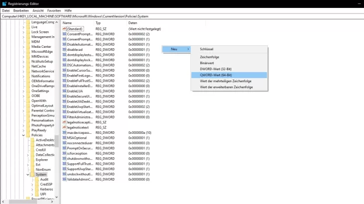 - In the window that now opens, navigate to the following path: ComputerHKEY_LOCAL_MACHINESOFTWAREMicrosoftWindowsCurrentVersionPoliciesSystem.