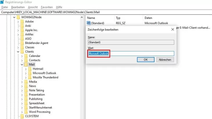 - To enter the correct name, go to "HKEY_LOCAL_MACHINESOFTWAREWOW6432nodeClientsMail" via the top bar. The other possible e-mail programs are listed here.
