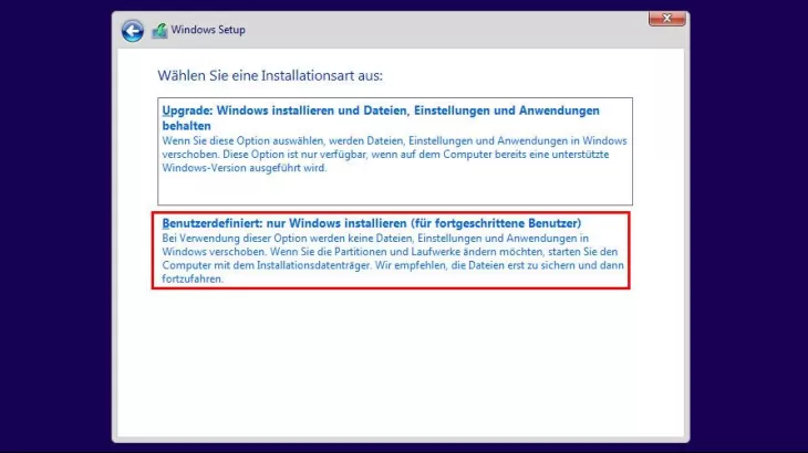 - Select the "Custom: install Windows only (for advanced users)" option for deleting the partitions during the installation process. All partitions on the hard disk will then be displayed.