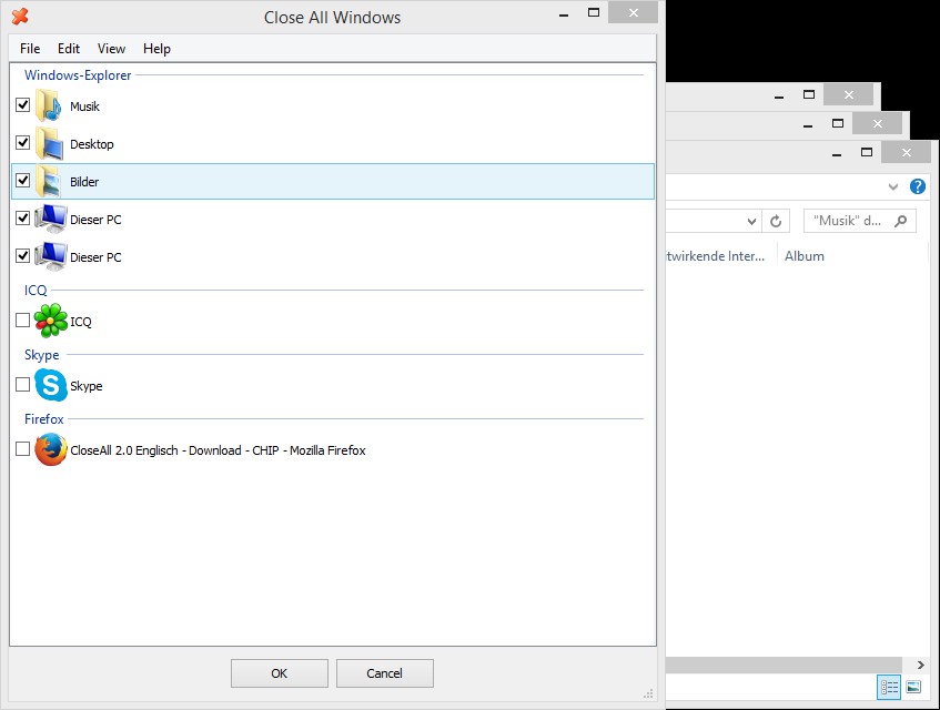 - Windows: since Windows XP, you can close the active window in the foreground with the key combination [Alt] + [F4]. You want to quit all of your open Windows, press and hold this key combination until all open applications are gone.