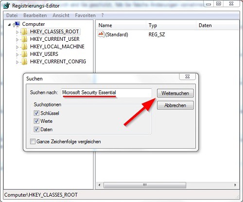 - Enter behind "Search:" the search term "Microsoft Security Essential". Click on the "next" button and wait for a Moment.