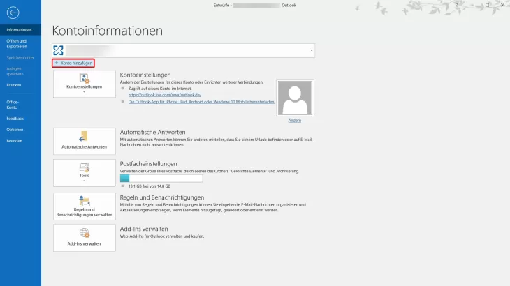 First, open the e-mail program, click with the mouse on File at the top left and select the menu item Add account .