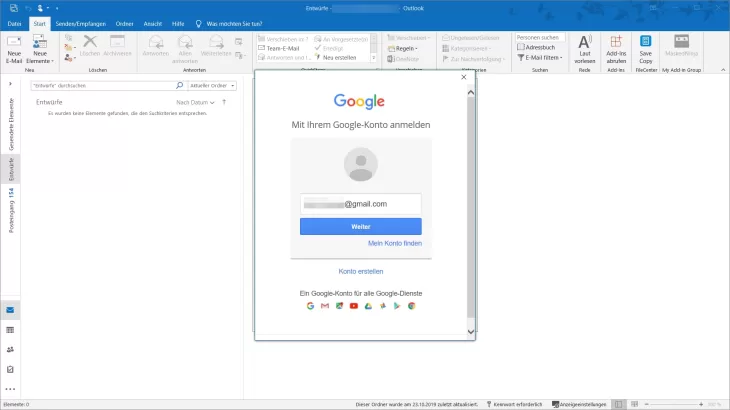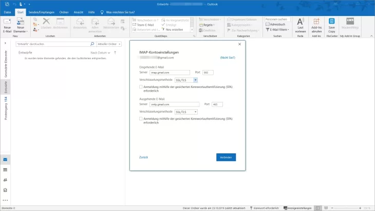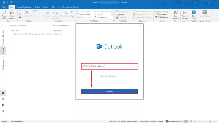 If your Gmail account could not be configured automatically, Outlook will display a corresponding error dialog. You can now also establish the connection manually.