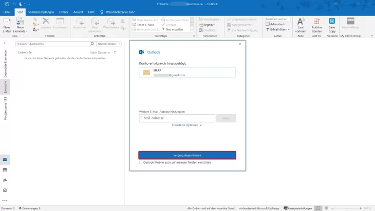 If this works, click Process complete - the Gmail account is set up in Outlook.