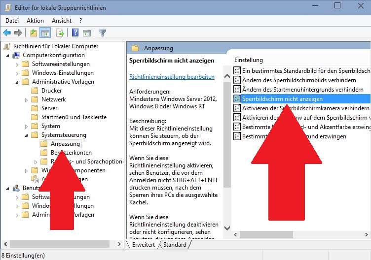 You have opened the local group policy Editor, you find on the left an outline. Here are all the group policies are classified in different categories. In this example, we change the Directive for the lock screen: