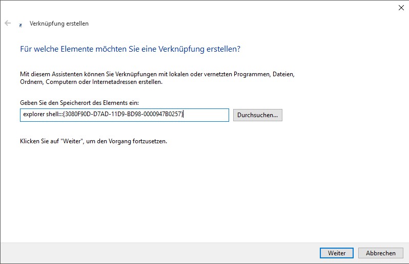 - As the location, enter "explorer shell:::{3080F90D-D7AD-11D9-BD98-0000947B0257}" and click "Next".