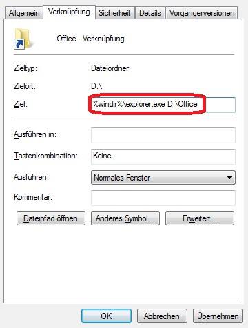 - In the field "target" add the "%windir%\explorer.exe" (without the quotation marks) before the path. Make sure that the Insert and the path are separated by a space.