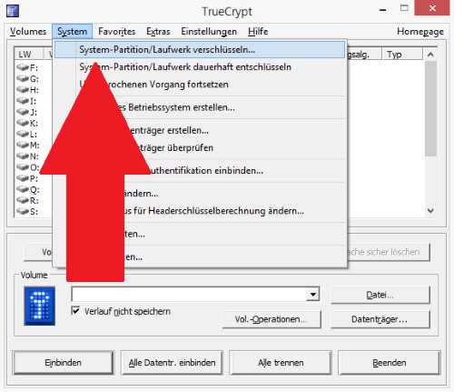 - Click above in the menu bar on the "System" and select the Option "System Partition/drive to encrypt" (see picture). Then a small window will open.