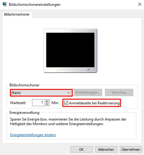 - First go to the control panel of your PC and open here "adaptation". Click on "screen saver" and make sure that either no screen saver or the check in the "sign-in page after reactivation" is set (see picture).