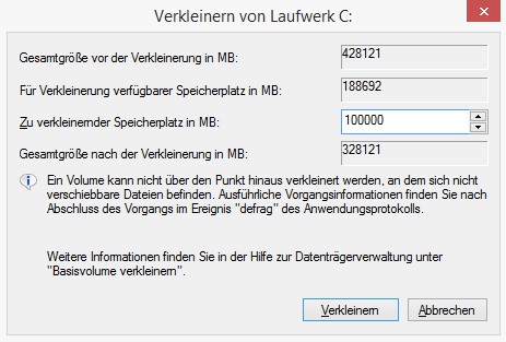 - Click with the right mouse button on the desired Partition (usually C:) and select the Option "shrink Volume".