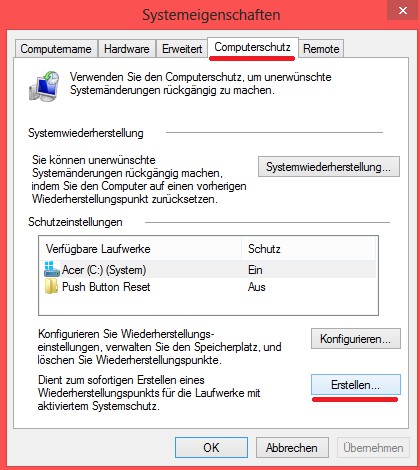 - Go to the tab "computer protection". Click for a new recovery point on the Button "Create new..." (see image).