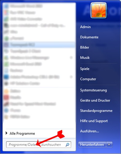 - Go to the start menu. In Windows 7, you will find directly under the menu item "All programs" a search form. About this you are looking for the "cmd.exe".