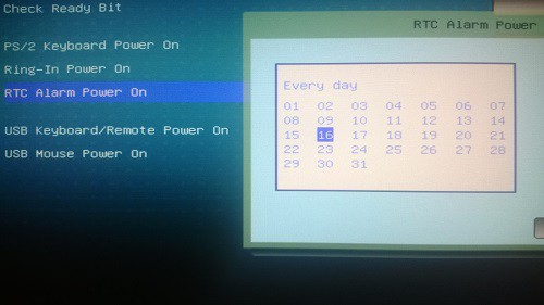 - Depending on the BIOS you will find here is a function that sets the startup. This is probably under "BOOT", "ADVANCED" or similar (see Screenshot) and is called the "RTC Powered launch" or "RTC Power Alarm". NOTE: If you have a newer Version of BIOS (UEFI), you can use the BIOS with the mouse. This is not the case, you have only the Navigation with the keyboard.