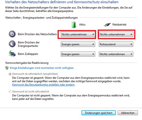 - To disable the shutdown by Pressing the power button, click on the two buttons behind "When you Press the power button" and select "do Nothing" (see picture).